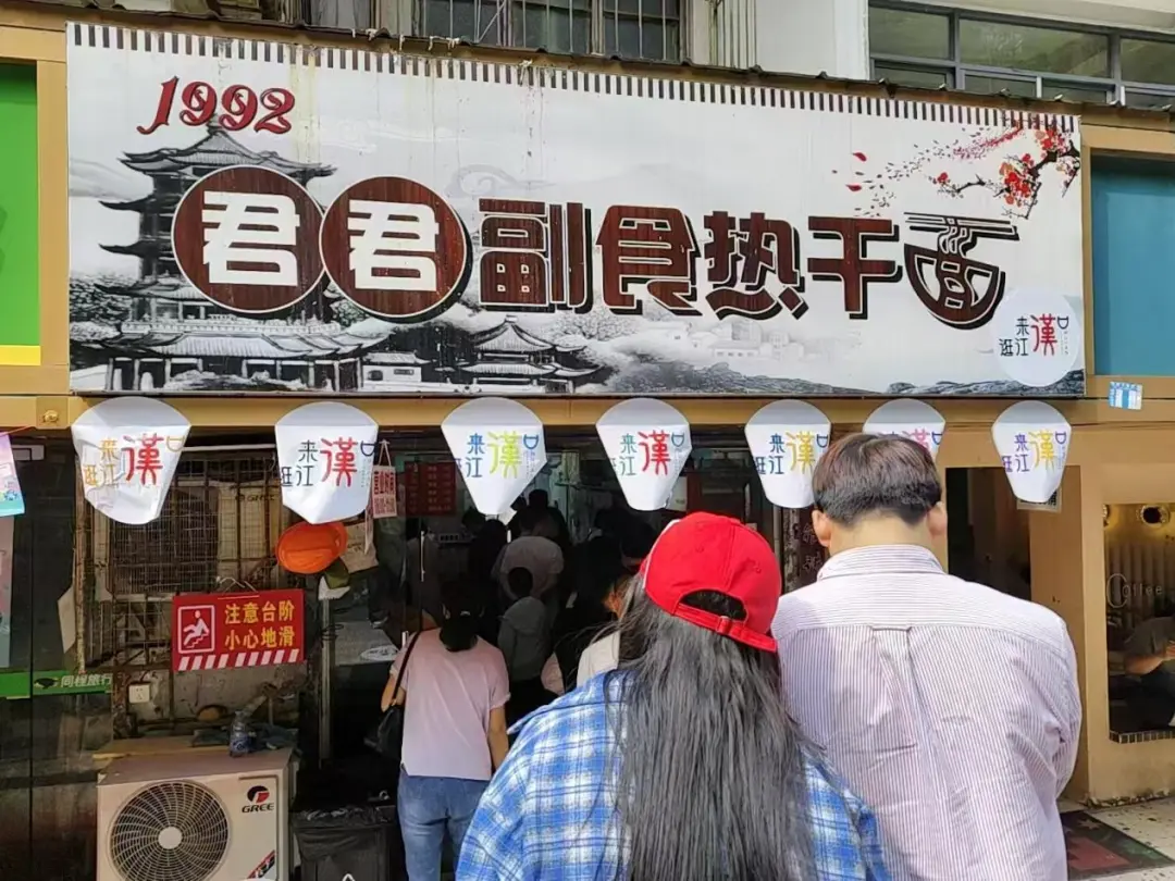 國慶中秋假期,江漢區(qū)游客量激增,君君副食的隊伍從店門口蜿蜒著排出數(shù)十米。社區(qū)志愿者舉著醒目的提示牌引導停車,網(wǎng)格員把路邊的共享單車統(tǒng)一移走,引導著慕名而來的食客井然有序地排隊等候?!耙郧耙坏焦?jié)假日就發(fā)愁,客人擠得轉不開身,現(xiàn)在有專人維持秩序,生意反而更穩(wěn)當了?!钡曛饔喟⒁滩林~頭的汗笑言。