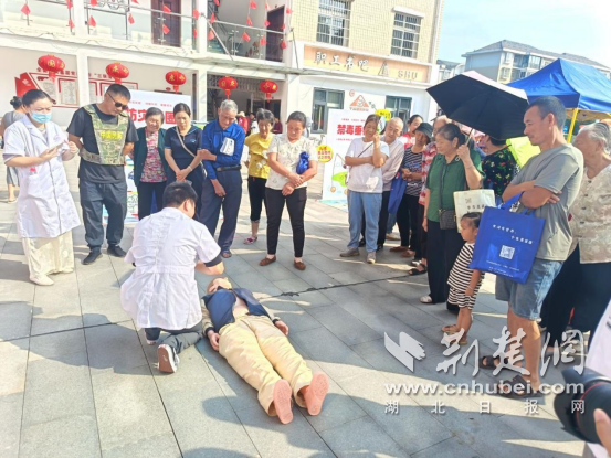 廣場另一側(cè),醫(yī)護(hù)人員鋪開模擬人體模型,演示燒傷包扎與心肺復(fù)蘇?!鞍惹鍧崅?,再用紗布從傷口下方往上層層固定,松緊度以能伸入一指為宜;做心肺復(fù)蘇時,按壓深度必須達(dá)5-6厘米,頻率保持每分鐘100-120 次,節(jié)奏就像跟著‘1001、1002’數(shù)數(shù)一樣均勻?!贬t(yī)護(hù)人員一邊說,一邊用手比劃著關(guān)鍵動作。講解完畢,邀請居民實操,遇到按壓角度偏斜、力度不足的情況,便俯身手把手糾正,耐心調(diào)整姿勢,確保每個人都能真正掌握正確要領(lǐng)。