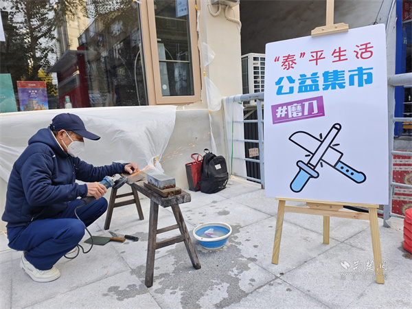 工會(huì)志愿者楊運(yùn)來(lái)為居民打磨刀具。 通訊員供圖