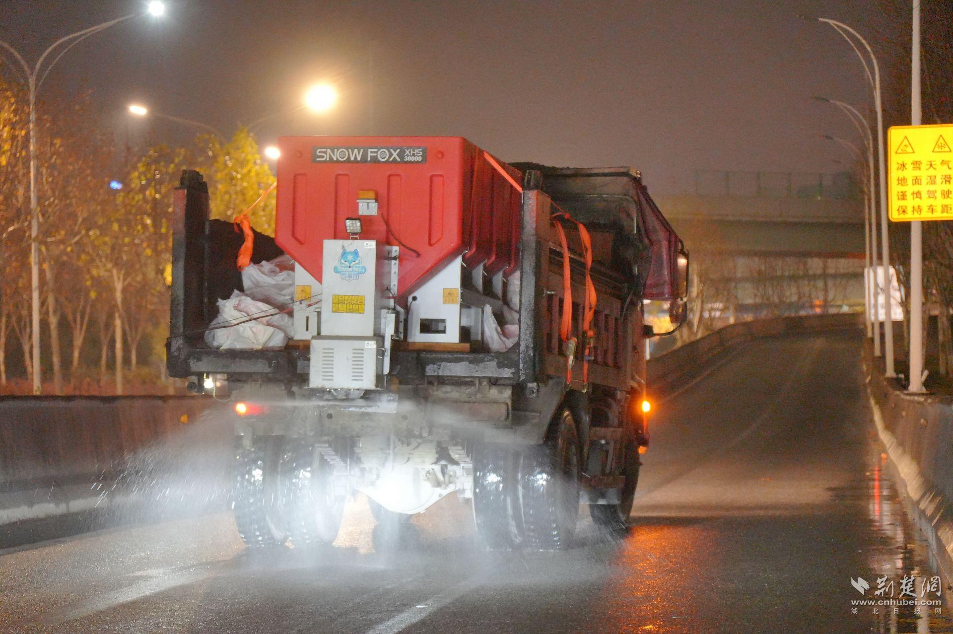 指令發(fā)出后,一線力量迅速到位。22時(shí)左右,硚孝高速匝道口,區(qū)服投臨空港市政環(huán)衛(wèi)公司的三臺(tái)融雪劑撒布機(jī)同步作業(yè)。融雪劑被均勻鋪撒在匝道和橋面,為后續(xù)可能出現(xiàn)的結(jié)冰提前“打底”。