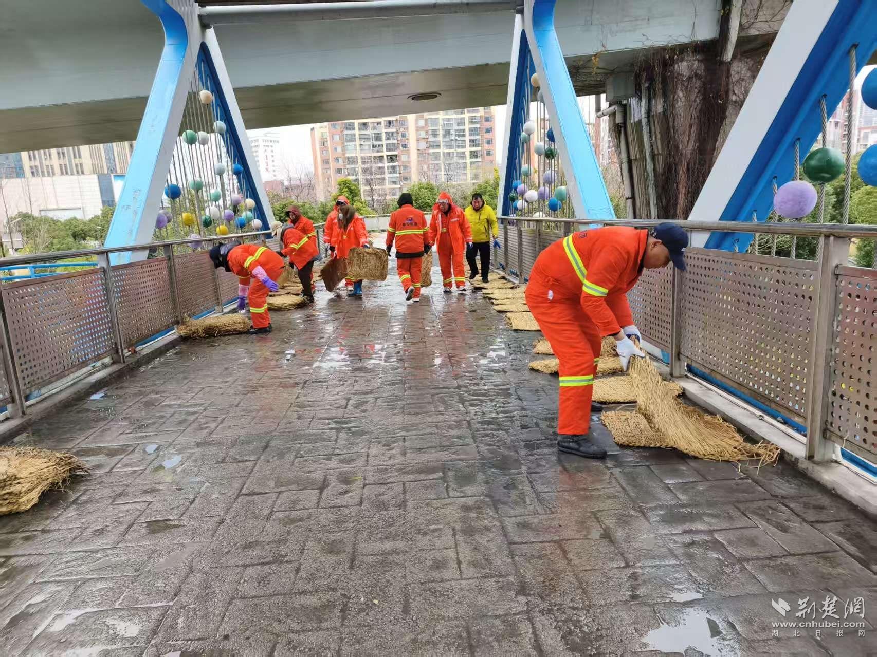 防滑措施同樣向行人集中區(qū)域延伸。19日17時(shí)起,吳家山環(huán)山路人行天橋上,環(huán)衛(wèi)工人與執(zhí)法隊(duì)員開始鋪設(shè)防滑草墊?!皹騼蓚?cè)是學(xué)校,晚高峰和早高峰人流集中,提前鋪設(shè)能減少滑倒風(fēng)險(xiǎn)。”吳家山街綜合執(zhí)法中心副主任陳偉說。