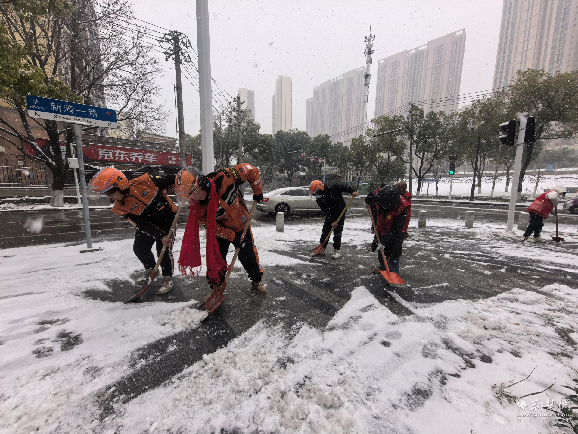 在花樓水塔街道,“蜂火輪”、“順豐掃雪隊”等志愿力量迅速集結(jié),30余名騎手、快遞員主動走上主次干道和小區(qū)道路,清理積雪、鏟除暗冰。在他們最熟悉的配送路線中,一條條安全通道被打通。