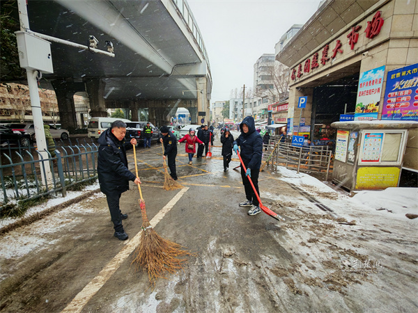 紫陽市場(chǎng)監(jiān)管所組織武泰閘市場(chǎng)及志愿者清雪除冰。 通訊員供圖