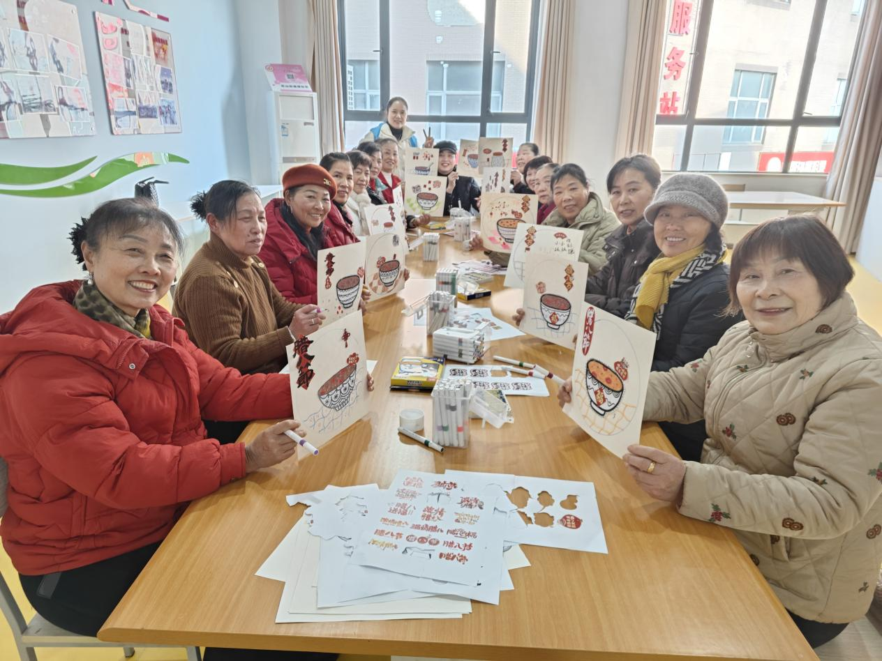 社區(qū)老年人活動(dòng)中心內(nèi),老人們圍坐在一起體驗(yàn)“溫情臘八”手工繪畫,在創(chuàng)作中增進(jìn)鄰里情誼?!昂枚嗄隂](méi)畫過(guò)畫了,今天好像回到了年輕時(shí)候!”74歲的李庭香老人舉著自己剛完成的《臘八團(tuán)圓圖》笑著說(shuō)道。