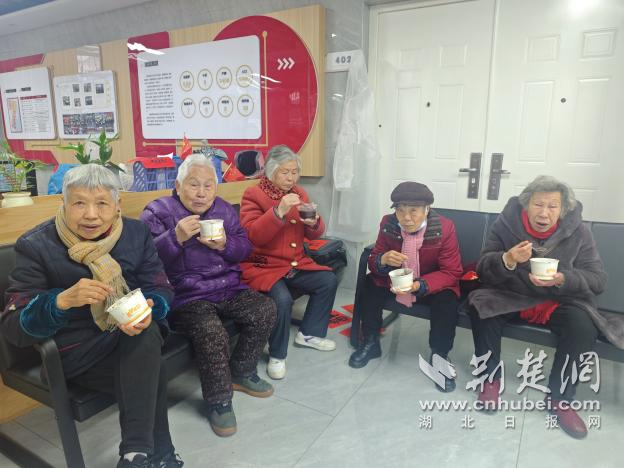 老年服務(wù)中心里,老年居民圍坐在一起品嘗臘八粥。通訊員供圖
