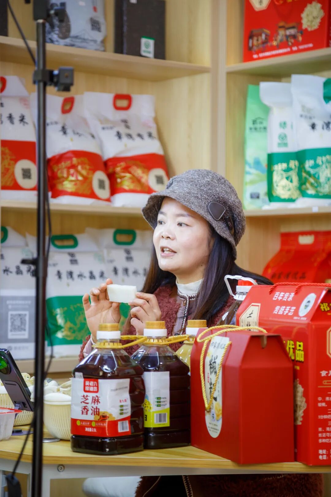 直播基地總面積達(dá)300㎡,是街道精心打造的綜合性農(nóng)業(yè)服務(wù)窗口,依托武漢云上耕農(nóng)業(yè)發(fā)展有限公司搭建的優(yōu)質(zhì)供應(yīng)鏈,匯聚了祁家灣及周邊十余家家庭農(nóng)場(chǎng)、合作社的二十余種特色產(chǎn)品——鮮榨菜籽油、優(yōu)質(zhì)大米等糧油調(diào)味,純散養(yǎng)土雞蛋、手工豆絲、風(fēng)干魚等特色農(nóng)產(chǎn)品,應(yīng)有盡有。