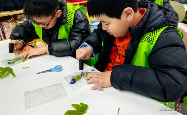 “童心造紙術(shù)·愛心拓染坊”課程把非遺技藝帶進(jìn)課堂。孩子們親手體驗(yàn)古法造紙,并用采集的桂花葉、香樟葉進(jìn)行植物拓染,將自然的紋理留存在紙上。這些拓印作品被精心制作成新年書簽,成為送給家人的“有溫度的禮物”。