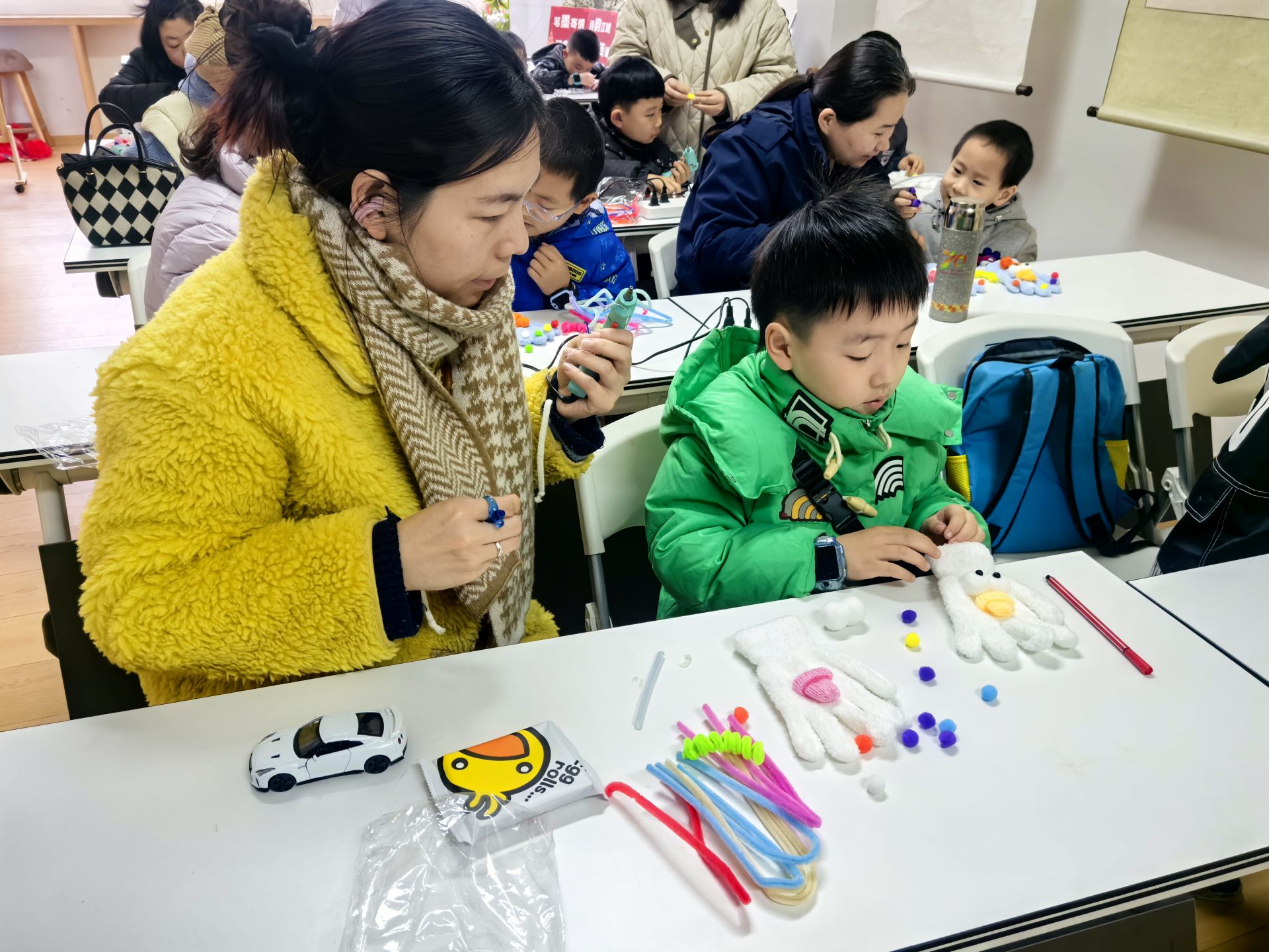 活動(dòng)開始,指導(dǎo)老師先為大家簡(jiǎn)要講解了傳統(tǒng)布藝中“拼接點(diǎn)綴、化繁為簡(jiǎn)”的制作理念。隨后,通過(guò)一步步的示范,引導(dǎo)大家將萌趣材料與傳統(tǒng)技法相結(jié)合。在創(chuàng)作環(huán)節(jié),家長(zhǎng)們耐心協(xié)助孩子固定面料、梳理細(xì)節(jié);孩子們則充分發(fā)揮天馬行空的想象力,用扭扭棒彎折出立體的耳朵與花紋輪廓,將彩色毛球粘貼成點(diǎn)綴裝飾,再為手套貼上靈動(dòng)的小眼睛。