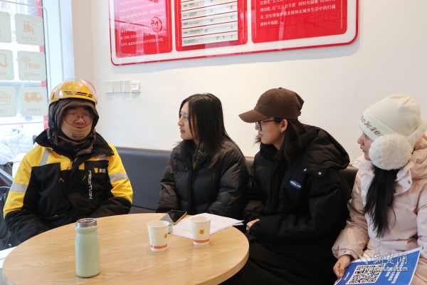 調(diào)研期間,實(shí)踐隊(duì)在街道統(tǒng)籌安排下,深入街道新就業(yè)群體服務(wù)驛站、新業(yè)態(tài)站點(diǎn)及“暖新聯(lián)盟”商家,通過實(shí)地走訪、座談交流、問卷調(diào)研等形式,與一線騎手、站點(diǎn)負(fù)責(zé)人、社區(qū)工作者面對(duì)面溝通。他們?cè)敿?xì)了解新就業(yè)群體工作生活狀況、現(xiàn)實(shí)需求與參與基層治理意愿,重點(diǎn)調(diào)研志愿積分激勵(lì)、“五大員”培育、“黃小蜂助老送餐隊(duì)”等特色項(xiàng)目的運(yùn)行成效。街道以服務(wù)型治理搭建信任紐帶、引導(dǎo)新就業(yè)群體融入基層治理的工作模式,為高校專業(yè)研究提供了鮮活的實(shí)踐樣本。