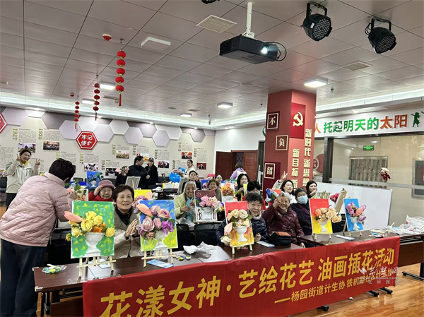 活動現(xiàn)場,長桌上整齊擺放著畫布、油彩、花材等材料。啟晨便民服務中心專業(yè)老師細致講解油畫色彩搭配、筆觸運用技巧,手把手指導花材修剪、造型搭配要領,耐心解答大家的創(chuàng)作疑問。居民們興致盎然,或蘸取油彩在畫布上揮灑創(chuàng)意,暈染出五彩斑斕的專屬畫作;或專注修剪花枝、搭配層次,一束束生機盎然的花藝作品接連成型,鄰里間相互交流心得、分享技巧,現(xiàn)場笑語不斷。