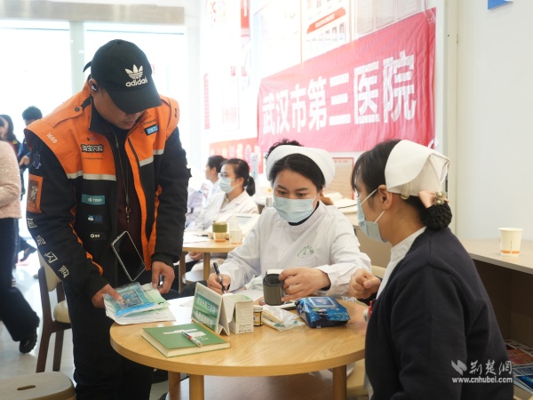互動環(huán)節(jié)采取“一站式集成服務(wù)”,將活動氛圍推向高潮。社保專家咨詢臺前,騎手們排隊咨詢靈活就業(yè)參保、待遇申領(lǐng)等問題;醫(yī)護(hù)人員同步開展義診服務(wù),提供血糖血壓監(jiān)測、骨質(zhì)疏松檢測,并手把手教大家正確使用筋膜槍,緩解肌肉疲勞;漢口銀行黃鶴樓支行工作人員現(xiàn)場為有需要的騎手辦理社保卡,并贈送貼心小禮品,打通職業(yè)傷害待遇享受“最后一公里”;愛聯(lián)盟工作室咨詢臺前,幾位年輕騎手駐足咨詢、登記意向,在忙碌生活中邂逅溫暖期待。