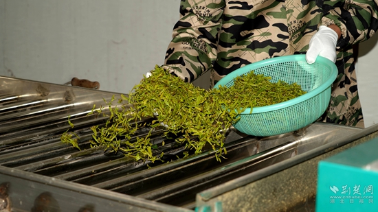 “我們現(xiàn)在是茶葉豐收期,所以我們生產(chǎn)車間都是24小時運轉(zhuǎn),工人都是三班倒,確保每天能產(chǎn)干茶600多斤。” 蘄春蟹子地茶業(yè)有限公司總經(jīng)理吳風(fēng)長高興道。
