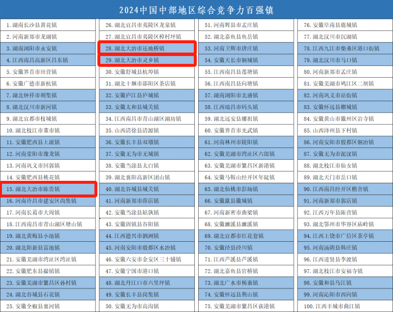 荊楚網(wǎng)(湖北日報(bào)網(wǎng))訊(記者左乙辰 通訊員 陳向東 羅蒙 范國安)近日,2024年鄉(xiāng)鎮(zhèn)高質(zhì)量發(fā)展交流會在湖南長沙召開,會上揭曉了2024年中國中部地區(qū)綜合競爭力百強(qiáng)鎮(zhèn)名單,大冶市陳貴鎮(zhèn)、還地橋鎮(zhèn)、靈鄉(xiāng)鎮(zhèn)上榜,分列第15、28、29位。