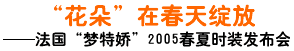 2005年4月5日,源自“時(shí)尚之都”巴黎的經(jīng)典法國(guó)時(shí)裝品牌夢(mèng)特嬌,于春天伊始在武漢香格里拉大飯店上演一場(chǎng)激情四溢的時(shí)尚秀。在夢(mèng)特嬌春夏時(shí)裝武漢發(fā)布會(huì)上,設(shè)計(jì)師們將經(jīng)典、動(dòng)感和優(yōu)雅融入夢(mèng)特嬌最新春夏亮絲時(shí)裝系列,將現(xiàn)代經(jīng)典、都市休閑魅力、動(dòng)感動(dòng)力、永恒經(jīng)典和瑰麗高雅五大主題一一呈現(xiàn)。而那最負(fù)盛名的“花朵”標(biāo)志,則仿若今春最絢爛綻放的花朵,在展示臺(tái)上奏出一支“春天的圓舞曲”。