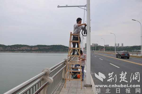 施工人員正在鄖陽漢江大橋安裝人臉識(shí)別系統(tǒng),2100米長的漢江大橋?qū)惭b167套防溺水防輕生監(jiān)控系統(tǒng),并實(shí)現(xiàn)云聯(lián)網(wǎng)。通訊員 王濤 攝