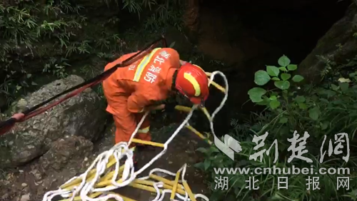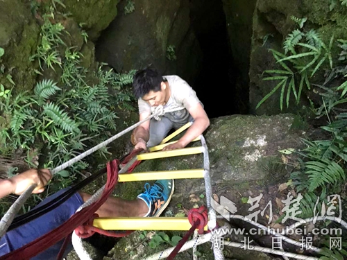 消防員搭建軟梯準(zhǔn)備入洞營救。 范斌斌攝