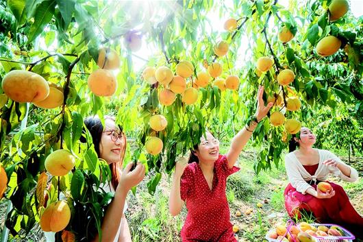 8月7日,嘉魚縣新街鎮(zhèn)嘉多寶果蔬、世外萄園的果園里碩果累累,游客體驗(yàn)著采摘的快樂。近年來,嘉魚縣新街鎮(zhèn)在351國(guó)道沿線建設(shè)“十里花果長(zhǎng)廊”,大力發(fā)展農(nóng)旅融合經(jīng)濟(jì)。(湖北日?qǐng)?bào)全媒記者陳勇通訊員耿海軍馬映攝)