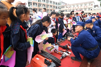 咸安區(qū)消防中隊(duì)將火災(zāi)逃生消防器材搬到演練現(xiàn)場,耐心地向?qū)W生們一一介紹空氣呼吸器、干粉滅火器、移動(dòng)式消防排煙機(jī)、無齒鋸等消防裝備器材的用處、特點(diǎn)和操作方法。通過講解消防安全和火災(zāi)逃生知識、滅火器材的使用方法,增強(qiáng)了同學(xué)們的消防安全意識和防火應(yīng)急自救技能。