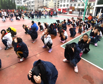 隨著校園內(nèi)一陣急促警報(bào)聲的響起,疏散演練正式開始。