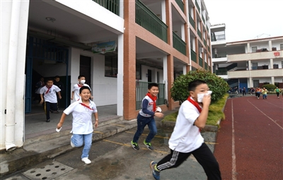 師生們一手捂著口鼻,一手扶著墻壁半蹲行進(jìn),緊張、有序、快速地撤離教室,短短的1分56秒,全校師生全部撤離到應(yīng)急避難場所——學(xué)校操場。接著,各班班主任迅速清點(diǎn)人數(shù),向校主任報(bào)告完畢,演練結(jié)束。