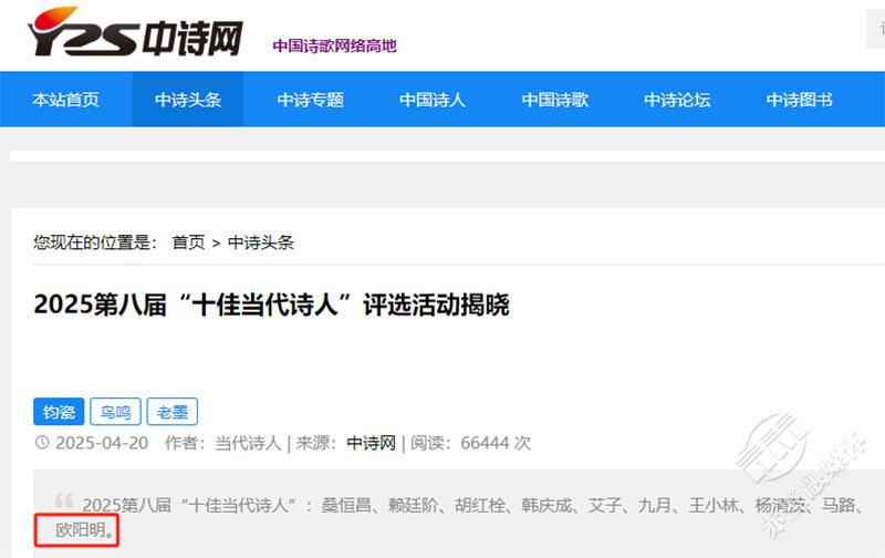 4月20日,2025第八屆“十佳當(dāng)代詩人”評選活動揭曉評選結(jié)果塵埃落定,赤壁詩人歐陽明光榮上榜,這是赤壁詩人首次在該榜亮相。