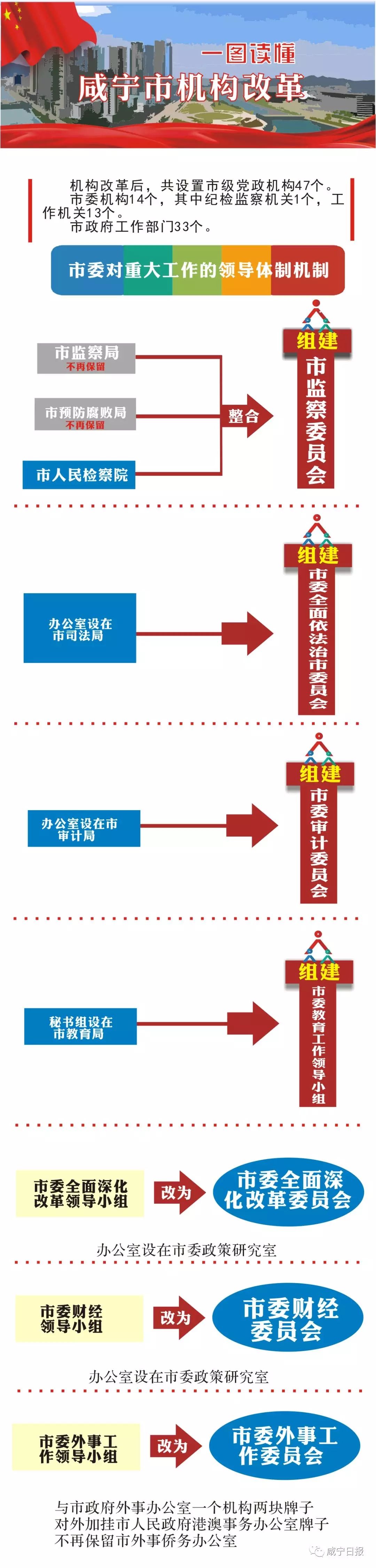 我市召開機構改革動員大會,標志著我市機構改革全面啟動。根據(jù)省委省政府批準的《咸寧市機構改革方案》,本輪機構改革后,市本級共設置黨政機構47個。市委機構14個,市政府工作部門33個。改革方案還對黨政直屬事業(yè)單位實施了限額管理,并進一步規(guī)范了黨政派出機構置。