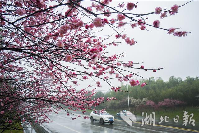 2月13日,咸寧市咸安區(qū)桂鄉(xiāng)大道兩旁的紅梅花在風(fēng)雨中含笑迎賓。