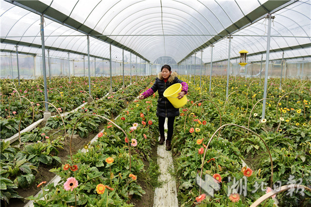 2月20日,通城縣石南鎮(zhèn)賽公村非洲菊種植專業(yè)合作社社員在采摘非洲菊供應(yīng)市場。該基地是當(dāng)?shù)胤掂l(xiāng)創(chuàng)業(yè)青年2016年底流轉(zhuǎn)100畝山地興建的,共有大棚90個(gè),種植非洲菊近十個(gè)品種,可年產(chǎn)鮮花1000余萬棵,暢銷武漢、岳陽等周邊城市,畝純收入2萬元。(視界網(wǎng)劉建平攝)