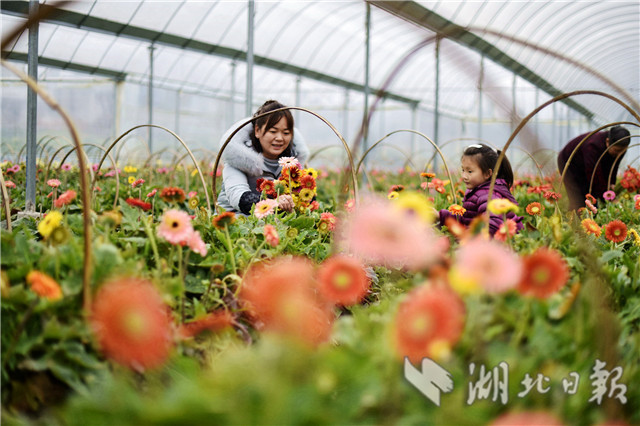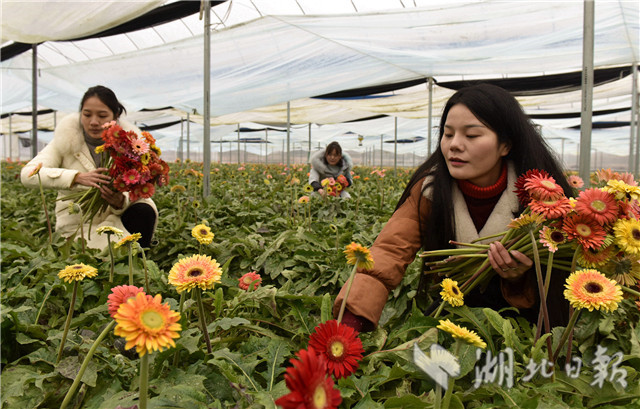2月20日,湖北省通城縣石南鎮(zhèn)賽公村非洲菊種植專業(yè)合作社社員在采摘非洲菊供應(yīng)市場。