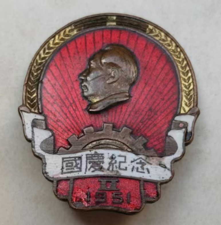這枚國(guó)慶紀(jì)念章分上下兩部分:上部分為大半圓形,由金黃色麥穗鑲邊,代表農(nóng)民階級(jí),中間為毛主席側(cè)面浮雕頭像,頭像下面是古銅色齒輪,象征著工人階級(jí)。齒輪上橫著一條白色的扭帶,將工人和農(nóng)民緊密地聯(lián)系在一起。扭帶上面寫(xiě)著 “國(guó)慶紀(jì)念”字樣。下部分為兩個(gè)重疊的長(zhǎng)方形,上面鑄有“Ⅱ”和“1951”。 整個(gè)紀(jì)念章的主色調(diào)為紅色,銅質(zhì)。