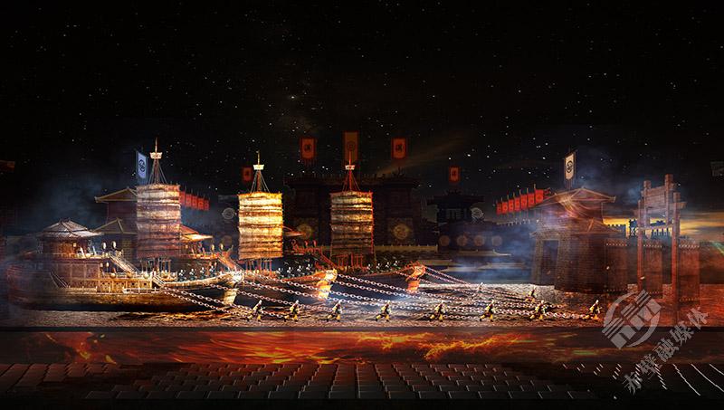 2000多年前,諸葛亮借的東風(fēng),是摧枯拉朽、克敵制勝的戰(zhàn)火雄風(fēng);2000多年后,三國(guó)赤壁古戰(zhàn)場(chǎng)借的東風(fēng),則是凝心聚氣、砥礪奮進(jìn)的時(shí)代之風(fēng)。演出將赤壁之戰(zhàn)這盤歷史大棋置于天地之間,以三國(guó)群雄為弈者,以演員和觀眾為棋子,利用光影特效與舞美裝置的變換,將戰(zhàn)役的多個(gè)關(guān)鍵情節(jié)進(jìn)行藝術(shù)化提煉與重構(gòu),運(yùn)用聲、光、電等現(xiàn)代舞美技術(shù),將歷史與現(xiàn)實(shí)、虛擬與真實(shí)融為一體,構(gòu)建起一個(gè)戰(zhàn)火紛飛、羽箭穿空的三國(guó)世界,讓赤壁之戰(zhàn)從史書中的符號(hào)躍升為可觸摸、可參與的精神場(chǎng)域。