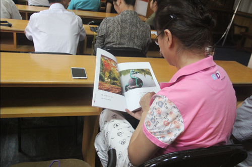 8月2日下午,在經(jīng)過半天休整之后,方老師開始為團員們講課!拔覀兝夏耆藨撚凶约旱呐d趣和追求,要學會自己找樂!薄艾F(xiàn)在小孩都是老年人在帶,我們學會了攝影就可以教孩子,對他們將來也有好處!狈嚼蠋煹囊幌,頓時就讓許多團員萌生了學攝影的想法。接著,他向團員們展示了自己拍攝的眾多精彩照片,并拿出一本攝影圖集供大家傳閱!斑@本圖集里,都是我在老年大學教書時,學員們拍的照片。最大的學員都80多歲了,但是照片拍的特別好。相信大家通過學習,也可以拍的如此精彩!狈嚼蠋煹脑,給了在座的老人極大的信心,大家也學的更加認真。