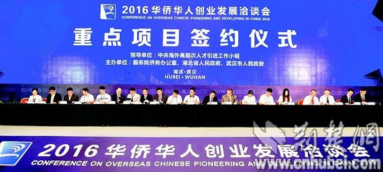湖北日報訊(記者周呈思)昨日上午,在2016華僑華人創(chuàng)業(yè)發(fā)展洽談會重點項目簽約儀式上,數(shù)十位中外簽約代表分三組上臺,集中簽約29個項目,包括10個人才項目、19個投資項目,其中投資過億元的項目達(dá)18個。