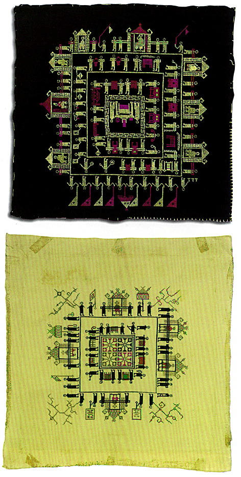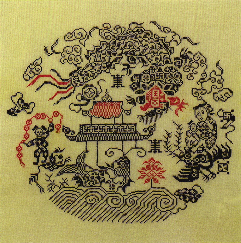 挑花針法有平挑花和十字花兩種,即在平布上面依紗眼用繡花針扣上十字形,然后以此為骨架,填置上多種需要花紋,采取反面挑花正面看手法,其優(yōu)點有二:一是保持清潔;二是便于打結(jié)。構(gòu)圖多是幾何圖形,也有動植物的幾何圖案。其結(jié)構(gòu)主要有對稱式、交叉式、二方連續(xù)式、斜菱形、單獨紋樣等等。圖案花紋既規(guī)整而又變化多姿,給人以舒暢愉快的感覺。