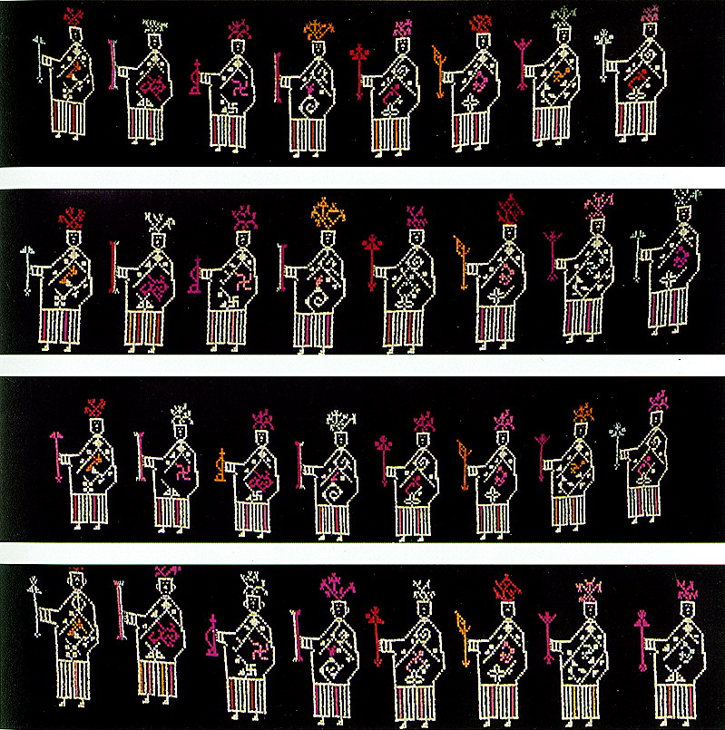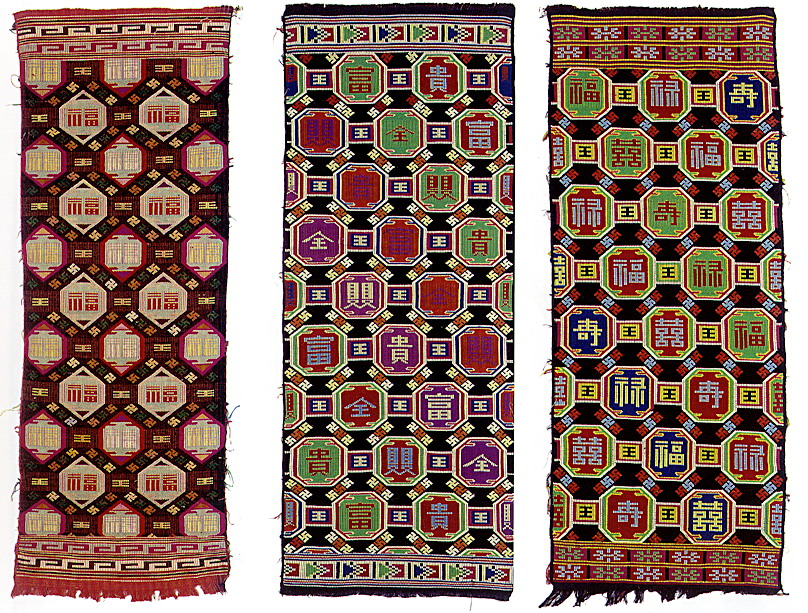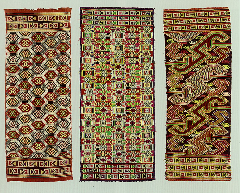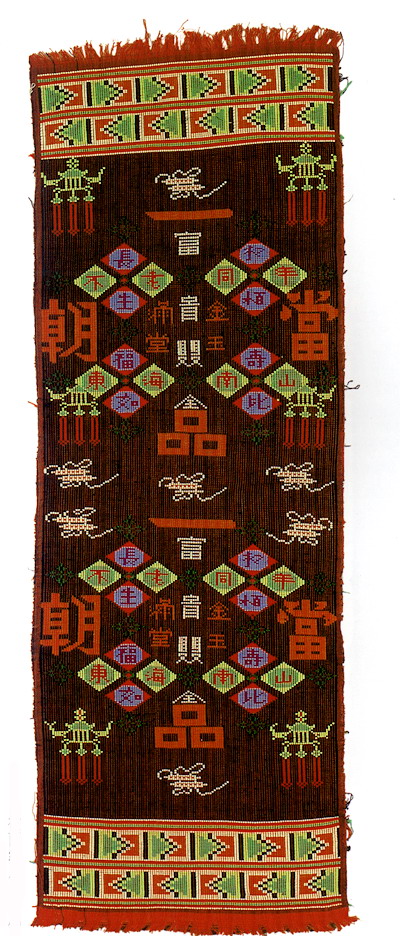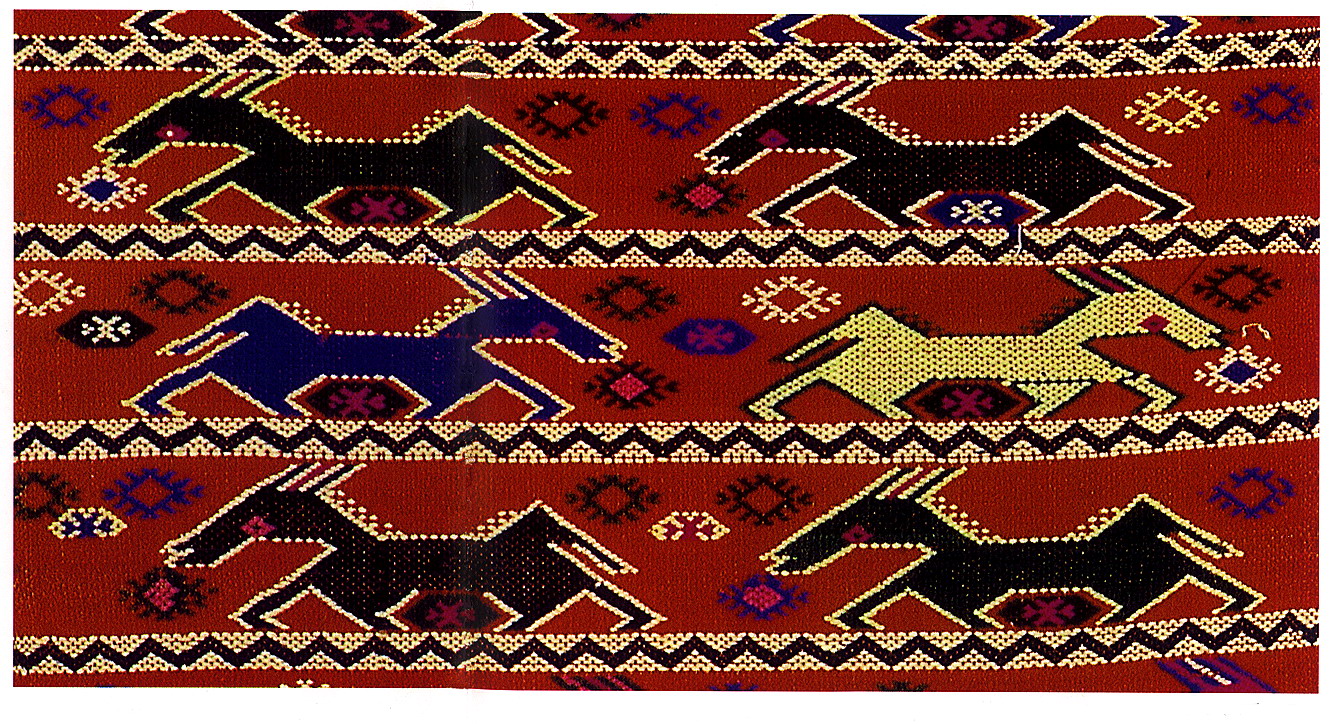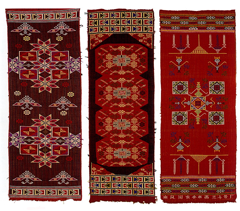 土錦以“通以斷緯”為編織手段,受巴楚文化的影響:1、紋飾既抽象又有形,土錦圖案來自對大自然的感受,身邊的物象也是編織者寄情抒懷的選擇,不論是對動物或用具,還是對天象星座,都能運用夸張變形的手法,達(dá)到抽象裝飾美的效果。2、色彩上注重原色與復(fù)色的互補:運用紅、黃、藍(lán)三色,并延伸以赤、黃、青、白、黑為五正色。